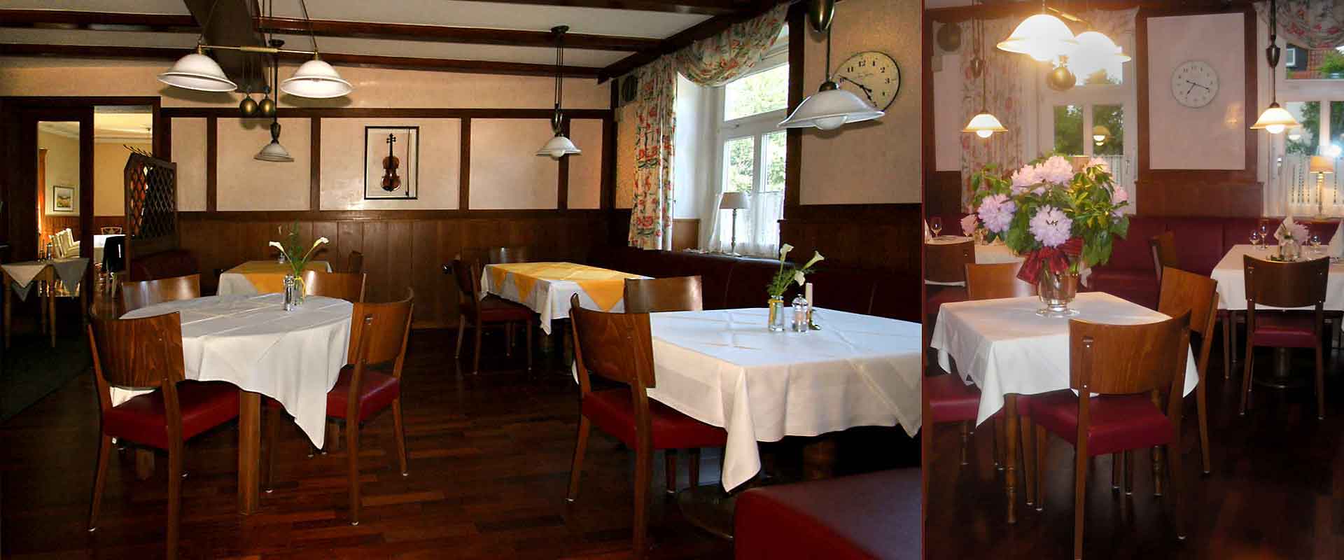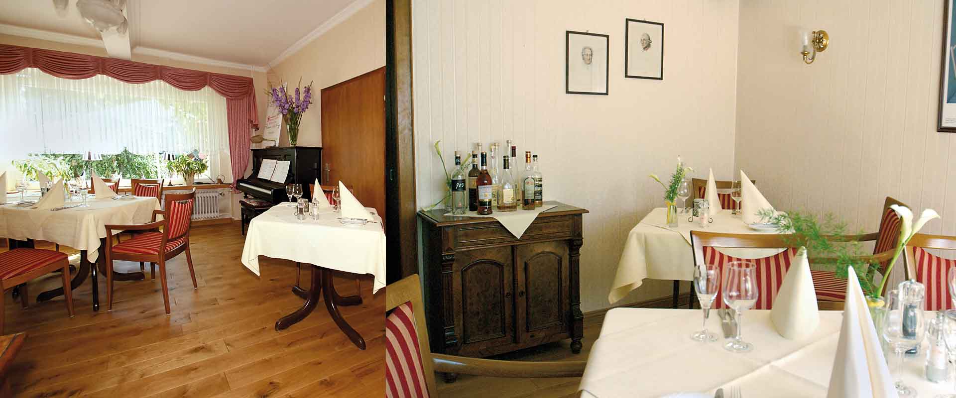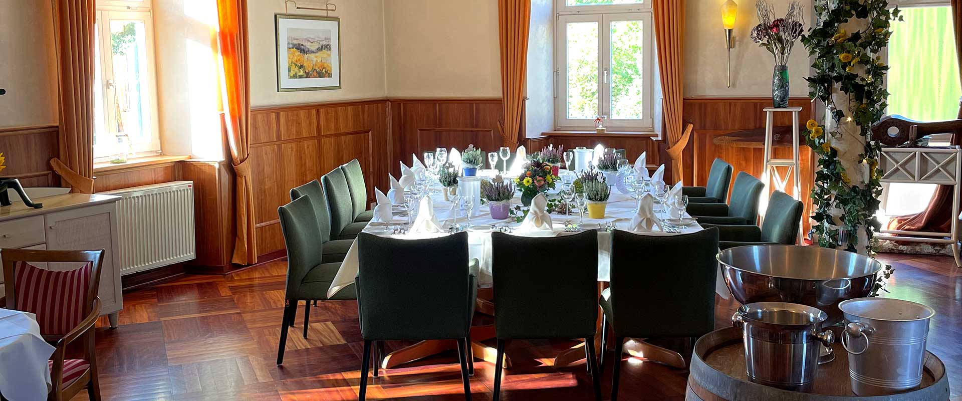 Geniesen Sie die Harmonie des Stils, unsere ambitionierte Küche und den aufmerksamen Service eines engagierten Familienbetriebes. ![]() Festlicher Saal für Gesellschaften bis ca. 40 Personen ![]() Gemütlicher Speiseraum im Landhausstil für ca. 18 Personen ![]() Der kleine Saal |