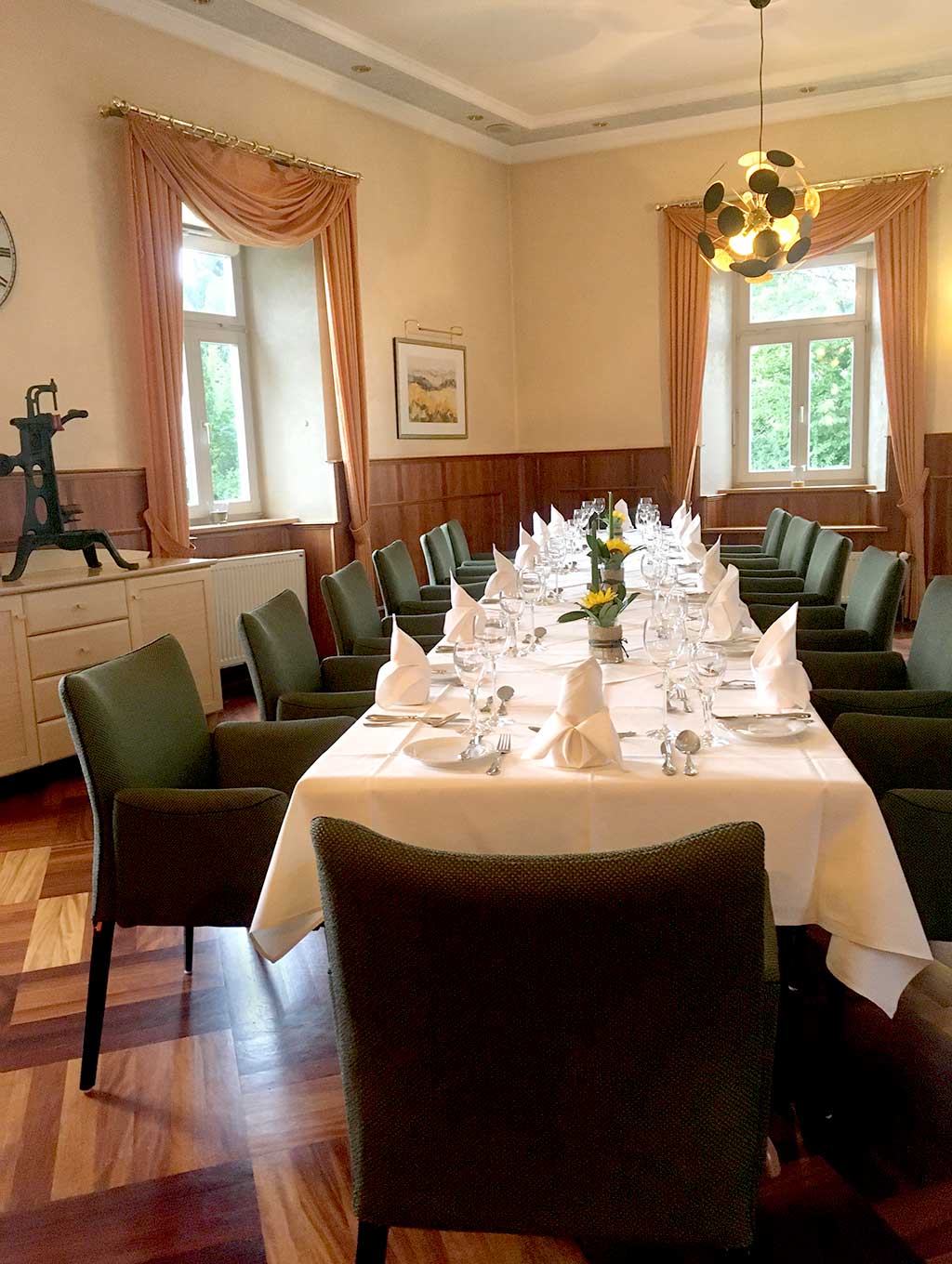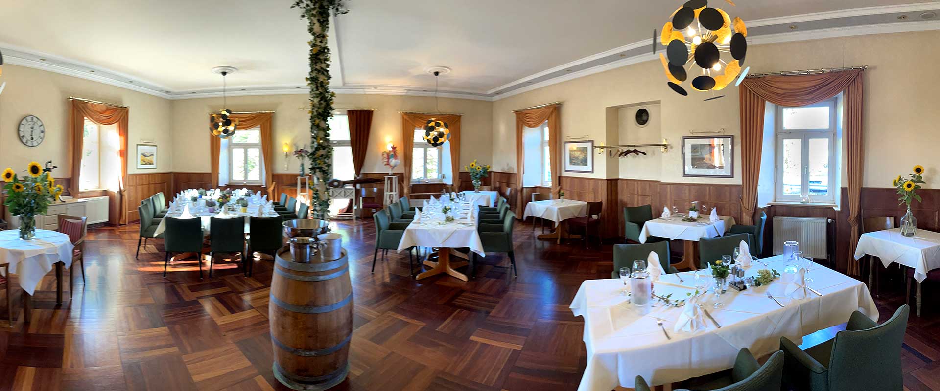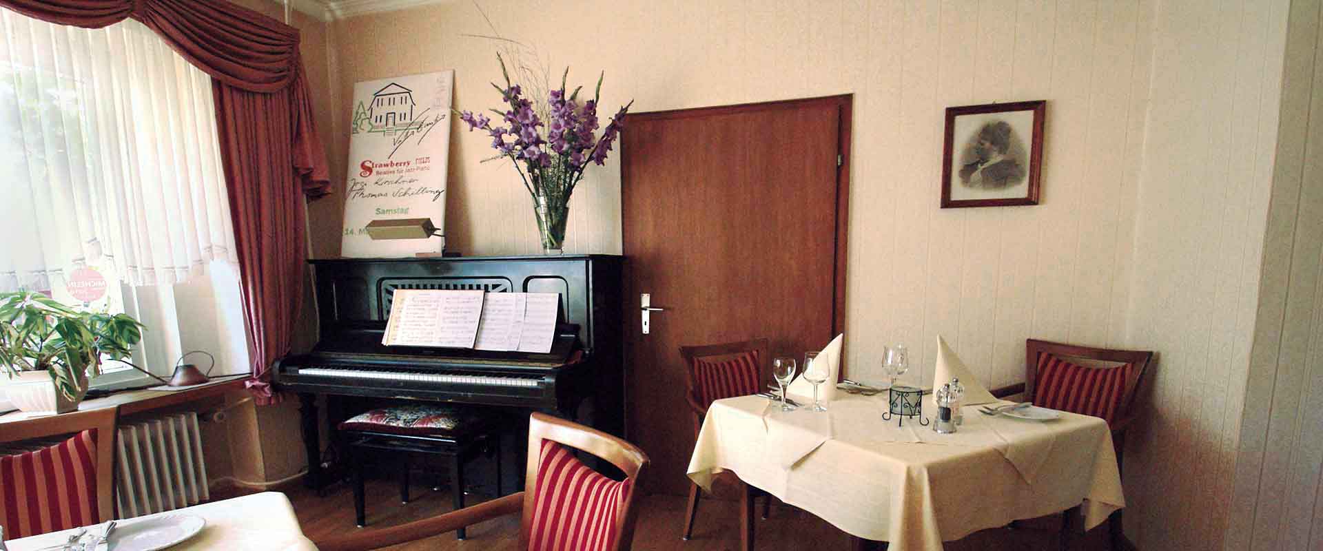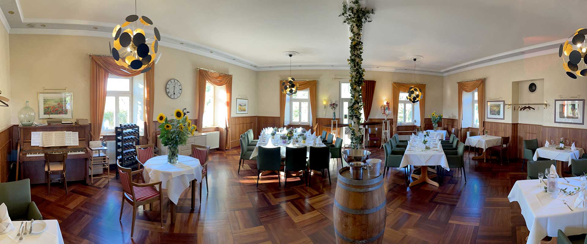 Geniesen Sie die Harmonie des Stils, unsere ambitionierte Küche und den aufmerksamen Service eines engagierten Familienbetriebes. ![]() Festlicher Saal für Gesellschaften bis ca. 40 Personen ![]() Gemütlicher Speiseraum im Landhausstil für ca. 18 Personen ![]() Der kleine Saal |